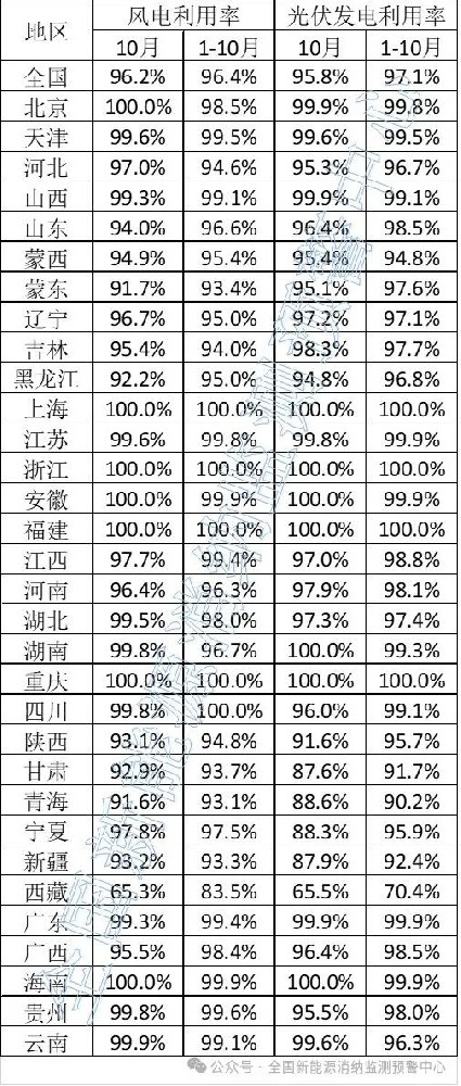 11月29日,全国新能源消纳监测预警中心公布10月各省级区域新能源并网消纳情况,10月光伏发电利用率光伏96.2%,风电95.8%。