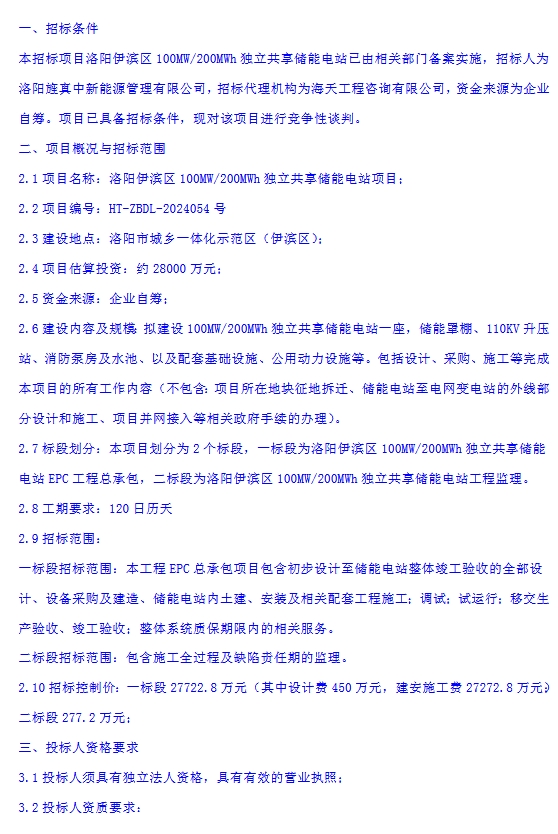12月4日,洛阳旌真中新能源管理有限公司发布洛阳伊滨区100MW/200MWh独立共享储能电站项目竞争性谈判公告,项目位于河南省洛阳市,拟建设 100MW/200MWh 独立共享储能电站一座,储能罩棚、110KV 升压站、消防泵房及水池、以及配套基础设施、公用动力设施等。包括设计、采购、施工等完成本项目的所有工作内容(不包含:项目所在地块征地拆迁、储能电站至电网变电站的外线部分设计和施工、项目并网接入等相关政府手续的办理)。