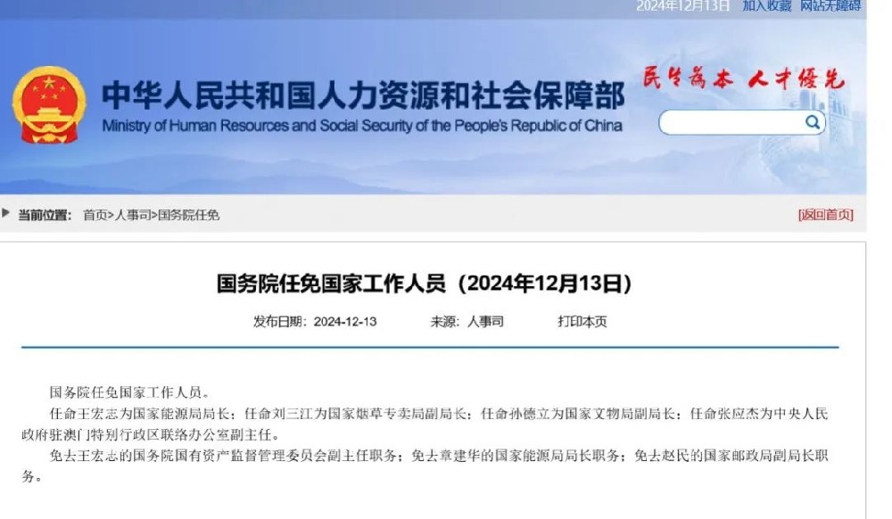 据人社部网站12月13日消息,国务院任免国家工作人员。其中,任命王宏志为国家能源局局长,免去章建华的国家能源局局长职务。