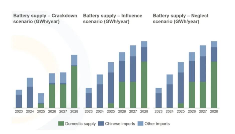 图2清洁能源协会(CEA)地设定的三种情景中估计的美国进口和供应电池量(GWh/年)