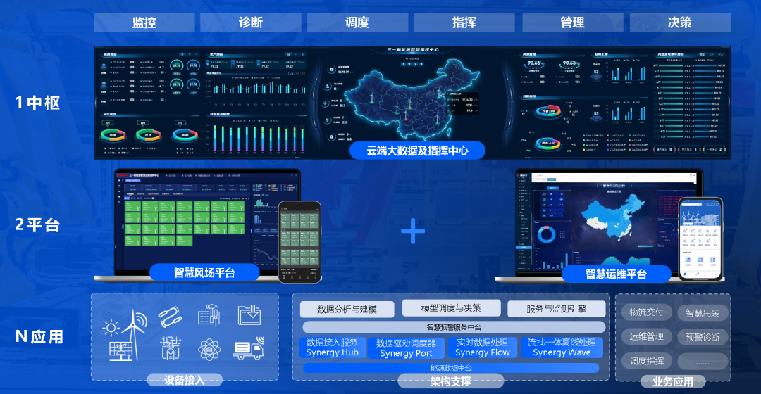 三一重能基于物联网、大数据、人工智能等先进信息化技术,构建了“1中枢、2平台、N应用”的数字化场站管理模式,实现风场区域全场景的智慧化管理。依靠风机诊断与故障预警模型,对机组实时进行健康诊断,实现对故障的提前预判,通过“预测、预警、预检、预修”的预防性运维举措,减少计划外停机时长及次数,降低发电量损失。