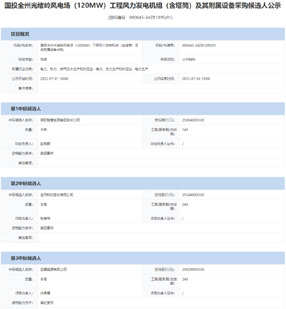 7月1日,国投全州光绪岭风电场(120MW)工程风力发电机组(含塔筒)及其附属设备采购候选人公示,明阳智能预中标,投标报价25884万元。