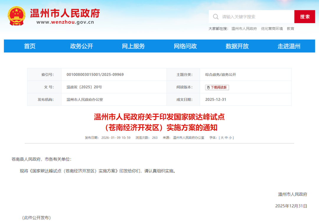 近日,浙江省温州市人民政府发布《关于印发国家碳达峰试点(苍南经济开发区)实施方案的通知》。