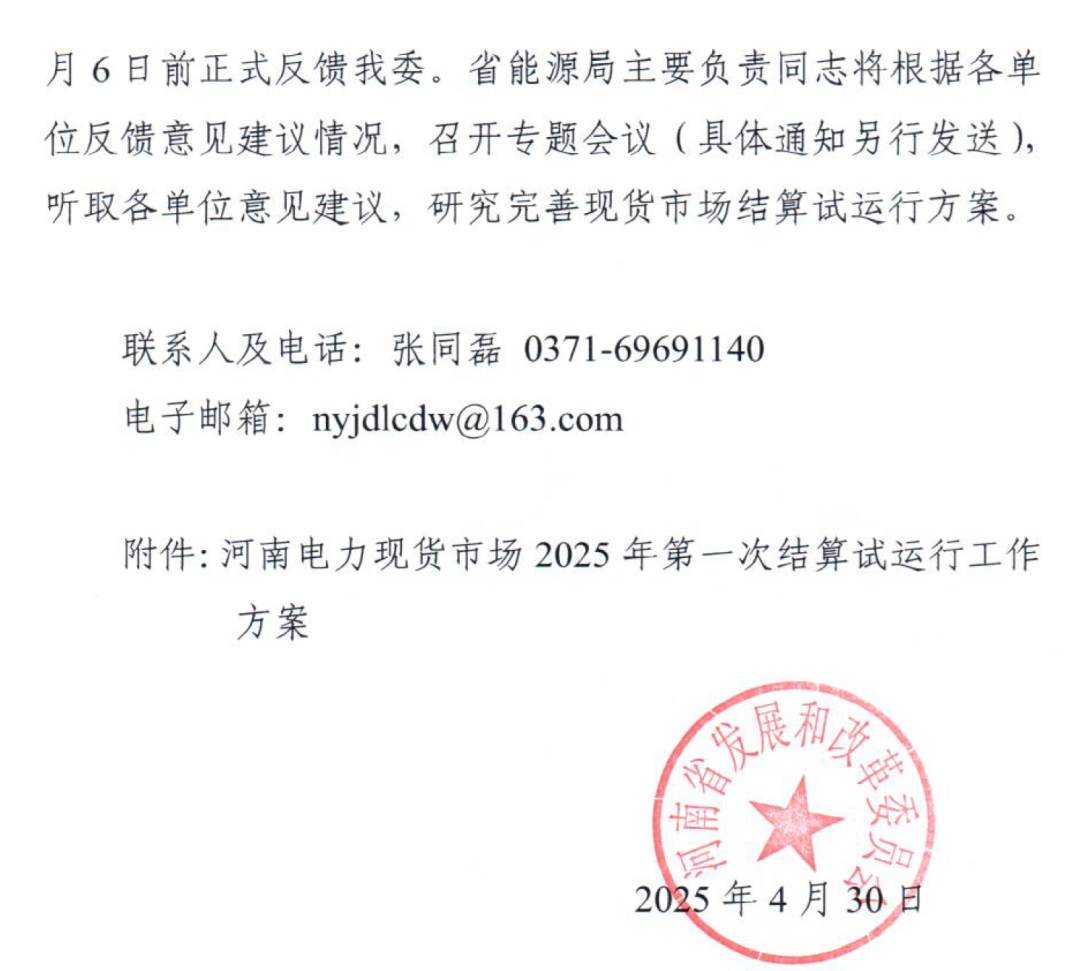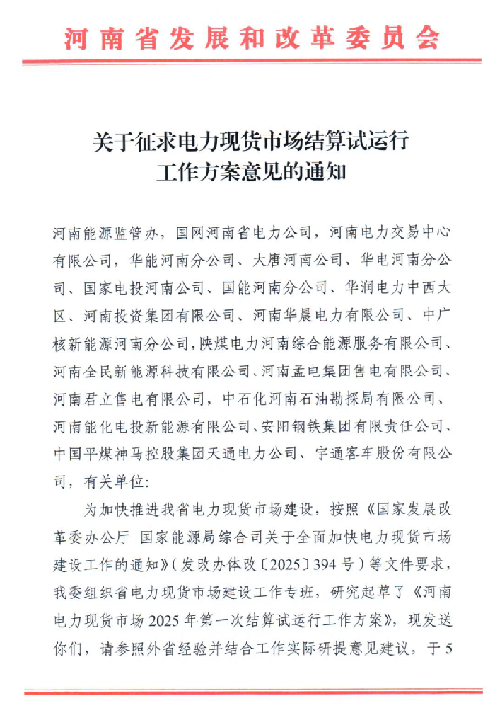 4月30日,河南省发改委发表了《关于征求电力现货市场结算试运行工作方案意见的通知》,针对《河南电力现货市场2025年第一次结算试运行工作方案》征求意见(以下简称《工作方案》)。河南将于5月份适时开展现货市场结算试运行。