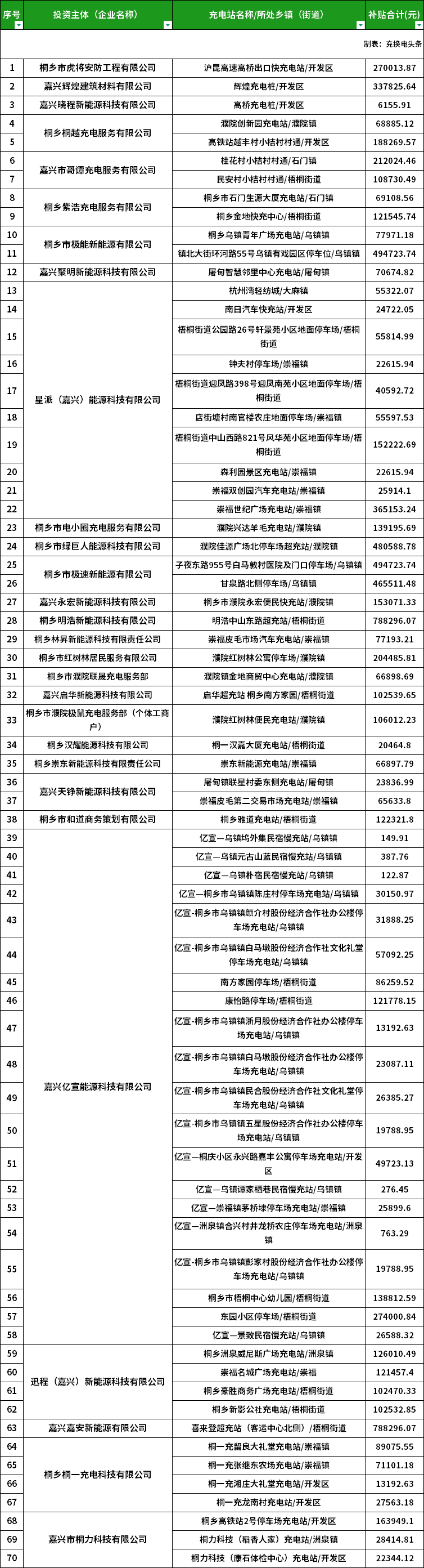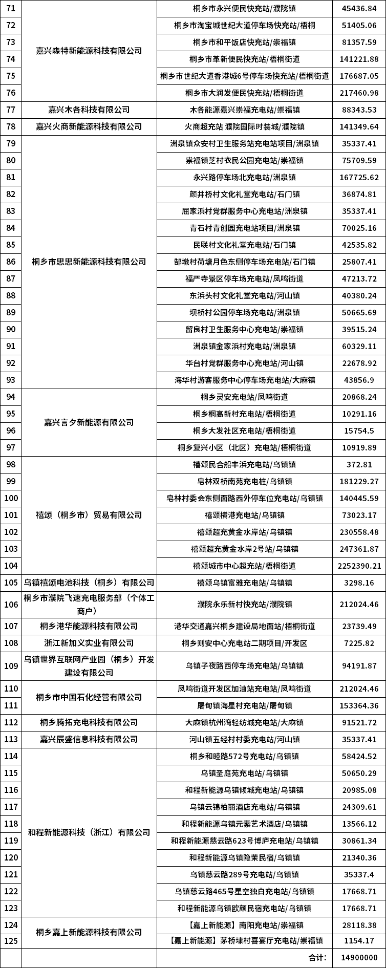 根据2024年度第二批新能源汽车充电基础设施奖励资金二次公示名单显示,桐乡市虎将安防工程有限公司、嘉兴辉煌建筑材料有限公司、嘉兴晓程新能源科技有限公司、桐乡桐越充电服务有限公司、嘉兴市哥谭充电服务有限公司、桐乡紫浩充电服务有限公司、桐乡市极能新能源有限公司、嘉兴聚明新能源科技有限公司、星派(嘉兴)能源科技有限公司、桐乡市电小圈充电服务有限公司、桐乡市绿巨人能源科技有限公司等44家企业,125座充电站获奖补资金。