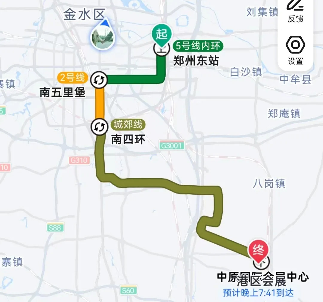 1 号线郑州东站上车→在紫荆山站(7站)下车→换乘地铁2号线(贾河-南四环方向)→南四环站(8站)下车→换乘地铁城郊线(郑州航空港站方向)→港区会展站(16站)下车,票价9元,约1小时45分钟。