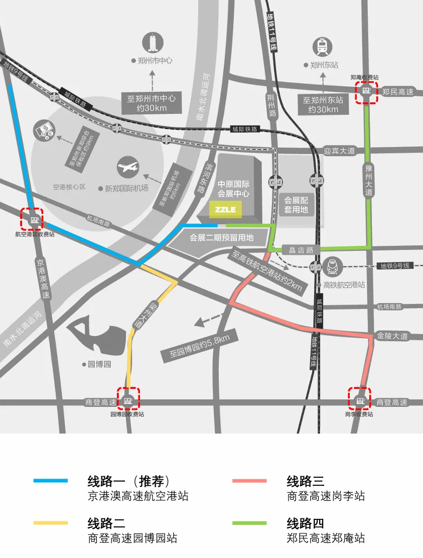 从郑州市区出发→经S1机场高速(或G4京港澳高速)航空港区收费站→华夏大道→金陵大道→滨河西路→亳都路→滨河东路→会展五路→中原国际会展中心(目前滨河东路与亳都路以南部分路段封闭,暂需滨河西路绕行)